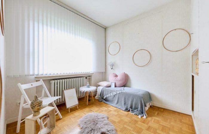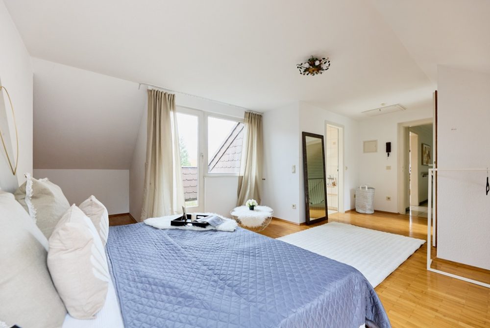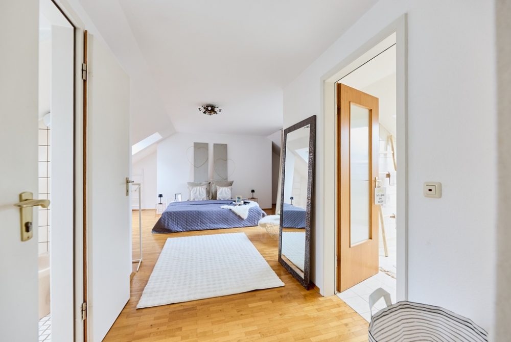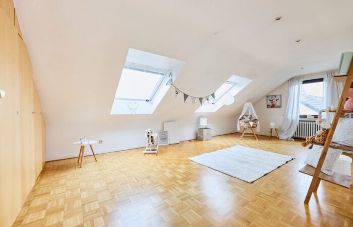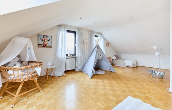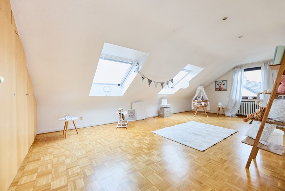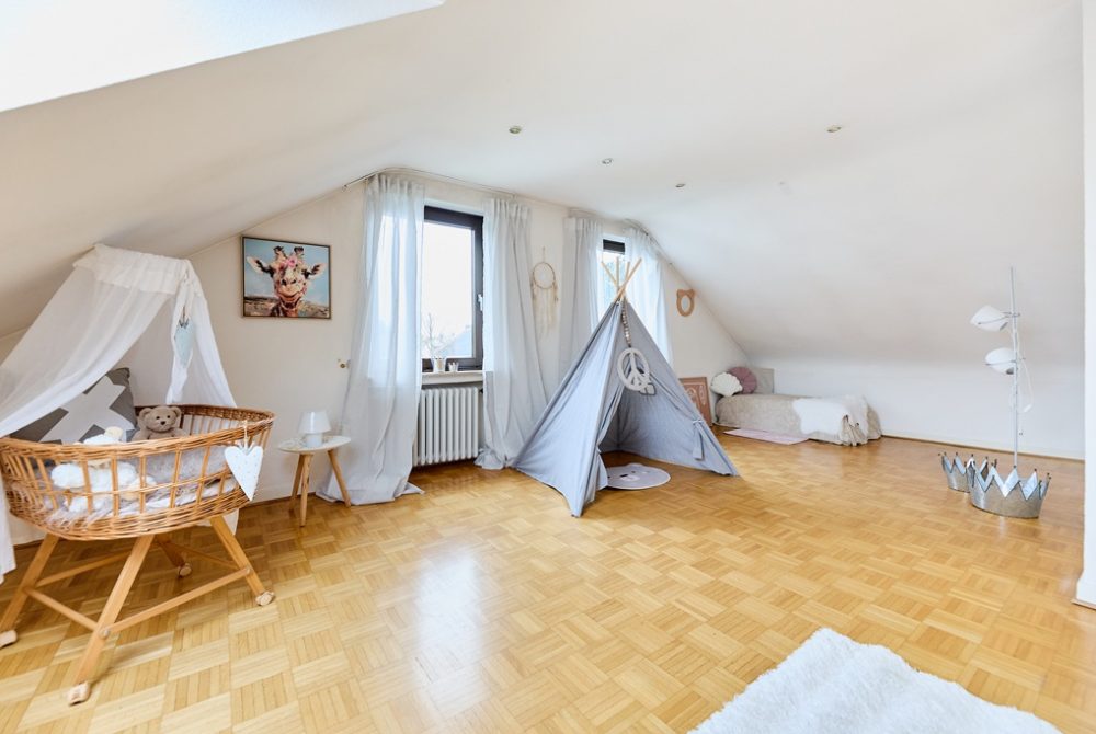 Über die großzügige Treppe geht es ins Obergeschoss. Hier wurde eine frühere Einliegerwohnung zu einem ruhigen Elternbereich umgestaltet, mit großem Bad, separatem WC und Zugang zu einer kleinen Loggia. Ein weiterer großer Bereich von ca. 27m² eignet sich ideal als Kinderzimmer. Dieser kann bei Bedarf auch in zwei Räume aufgeteilt werden.