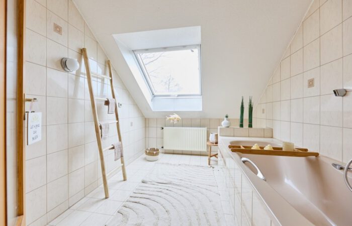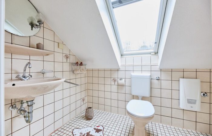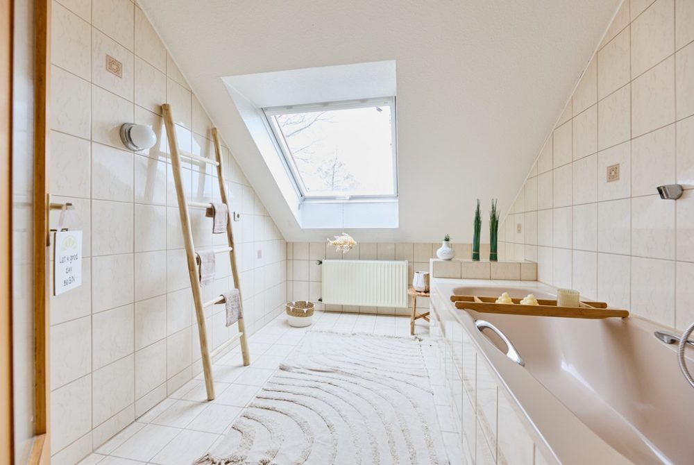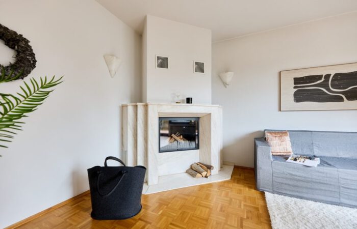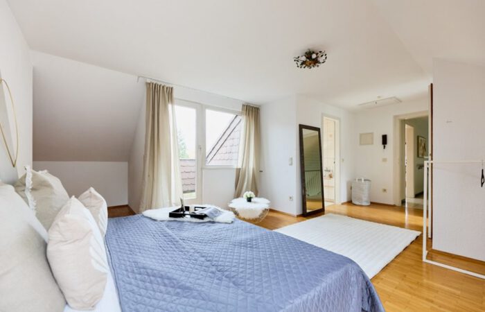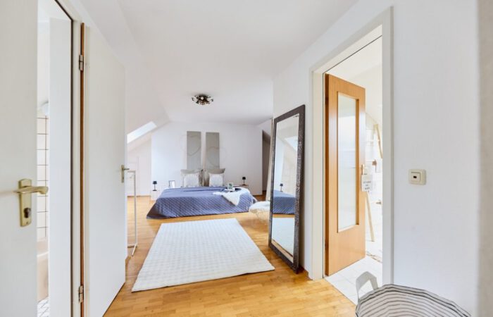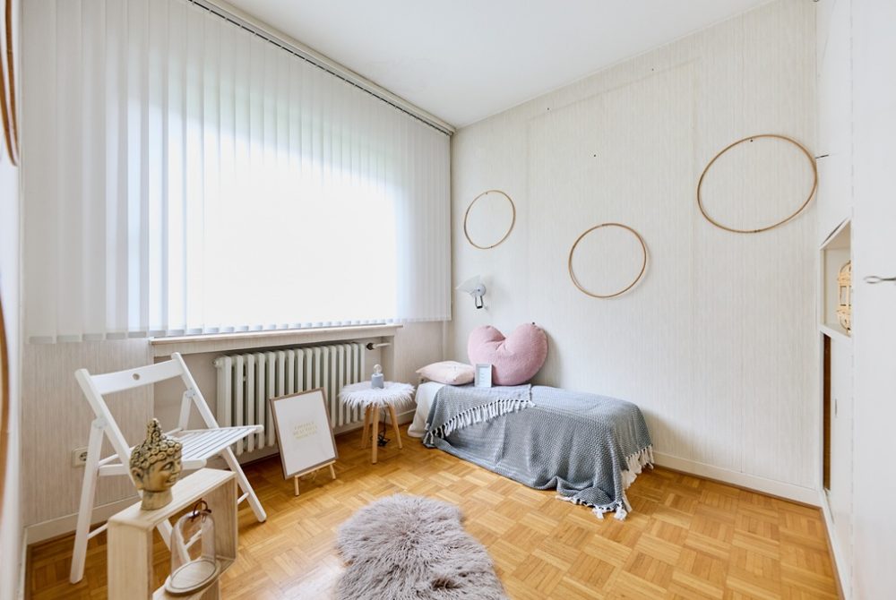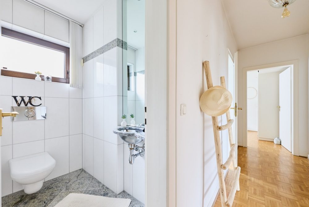 Über die großzügige Treppe geht es ins Obergeschoss. Hier wurde eine frühere Einliegerwohnung zu einem ruhigen Elternbereich umgestaltet, mit großem Bad, separatem WC und Zugang zu einer kleinen Loggia. Ein weiterer großer Bereich von ca. 27m² eignet sich ideal als Kinderzimmer. Dieser kann bei Bedarf auch in zwei Räume aufgeteilt werden.