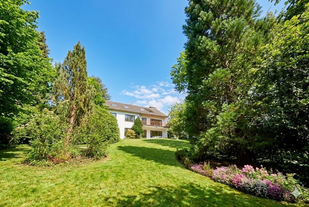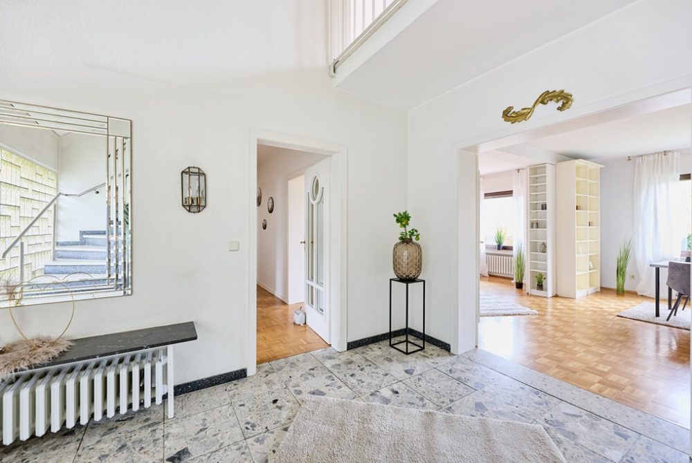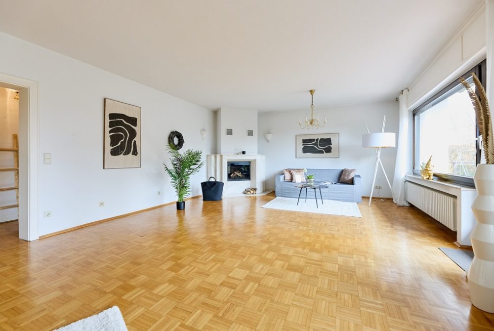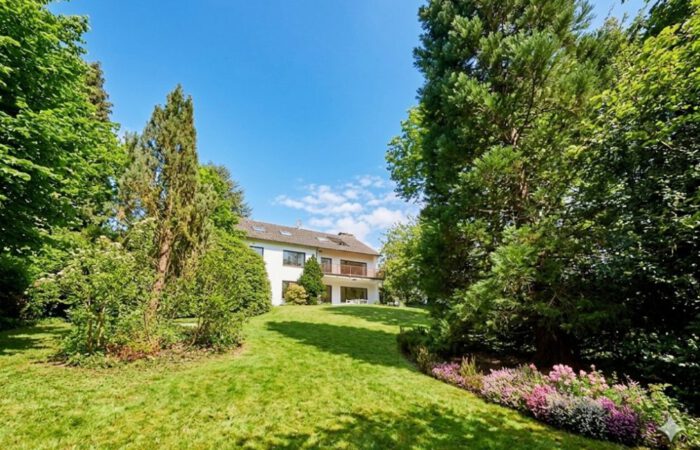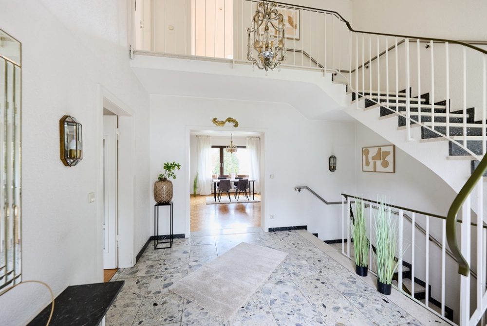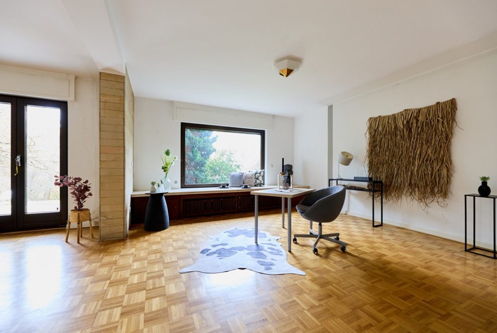 Im Erdgeschoss startet alles in einer Eingangshalle mit ca. 5m Deckenhöhe. Von dort gelangt man durch eine doppelflügelige, weiße Tür mit Facettenschliffgläsern in den luxuriös großen Wohn-Essraum mit ungestörtem Weitblick in den parkähnlichen Garten. Viele Fenster holen den rundum eingewachsenen Garten direkt ins Haus und sorgen für ein entspanntes Wohngefühl, komplett ruhig und nicht einsehbar. Vor dem Wohnraum liegt der große Balkon in Westausrichtung. Er bietet mit 14m² Fläche einen imposanten Sitzplatz mit freiem Blick in die Natur. Ein großer Kamin im Wohnbereich sorgt für pure Gemütlichkeit und ein sehr gut erhaltener Eichenparkettboden für eine elegante Wohnatmosphäre. Ergänzt wird die Ebene durch eine große Küche mit Essplatz und zwei weiteren, flexibel nutzbare Zimmer, zu Bürozwecken oder für Gäste. Selbstverständlich stehen auch ein Duschbad (barrierefrei) und ein Gäste-WC auf dieser Etage zur Verfügung.