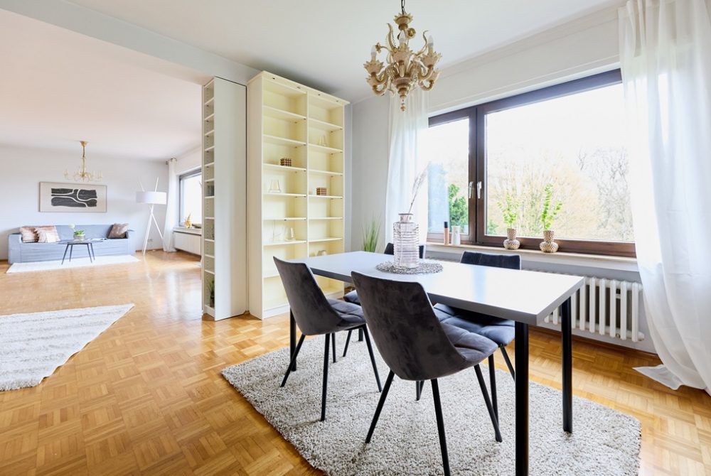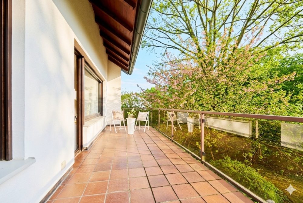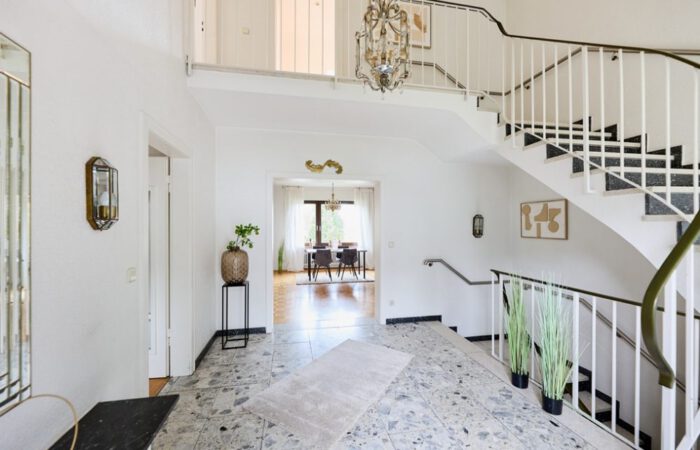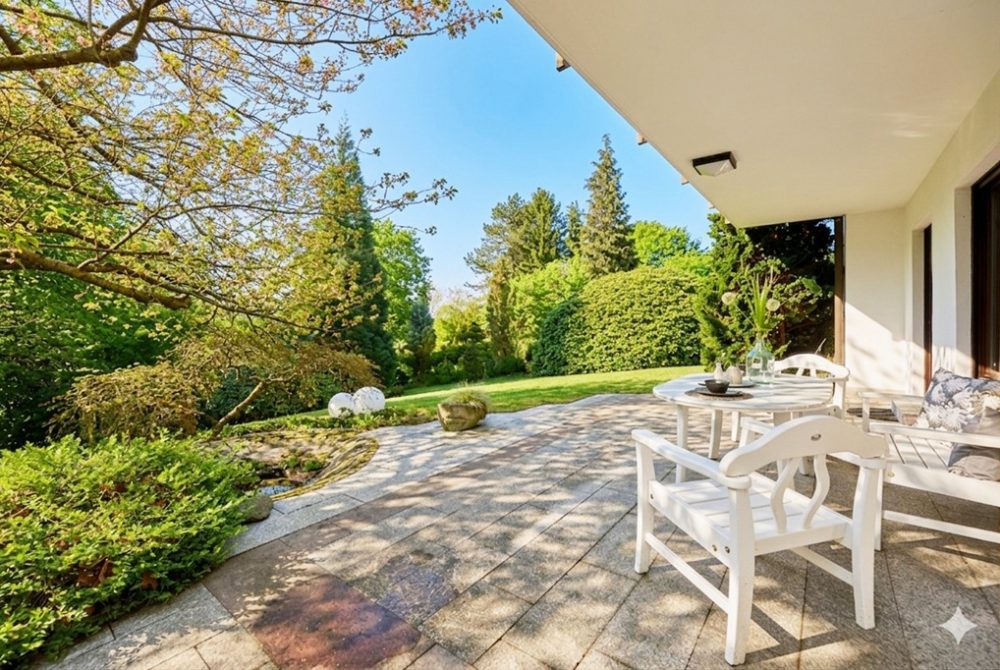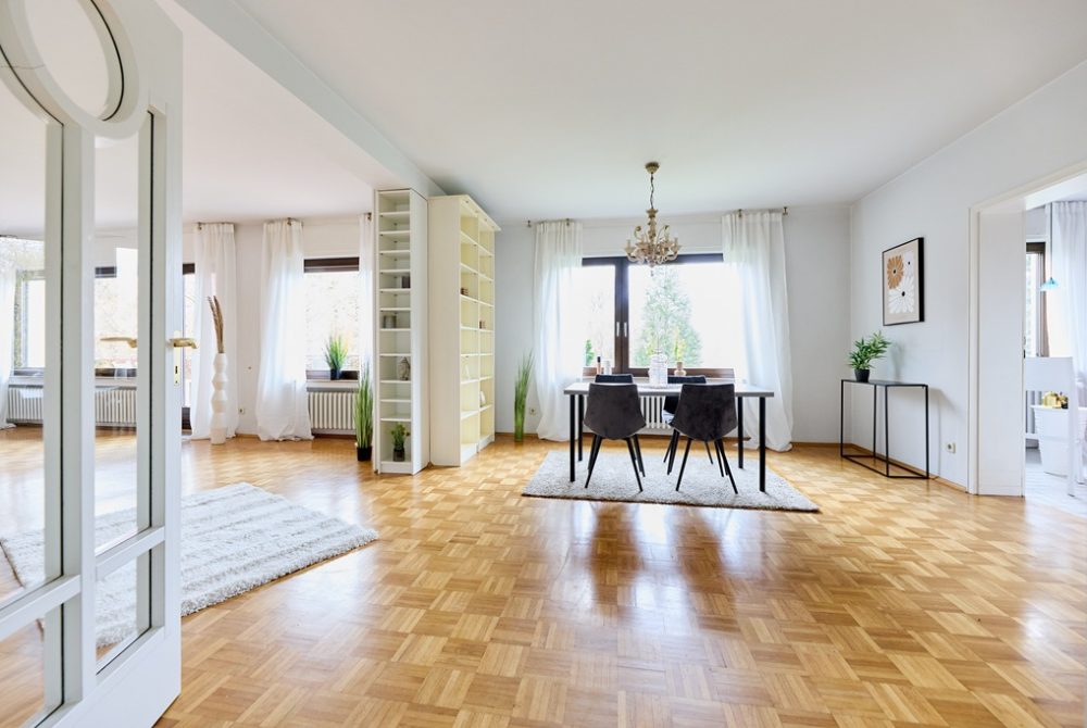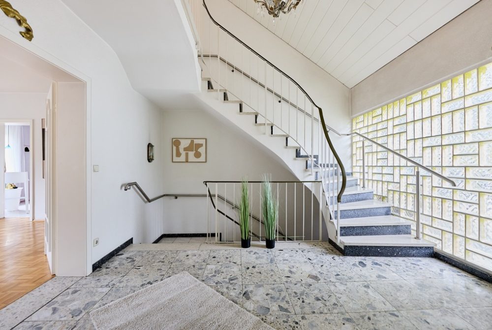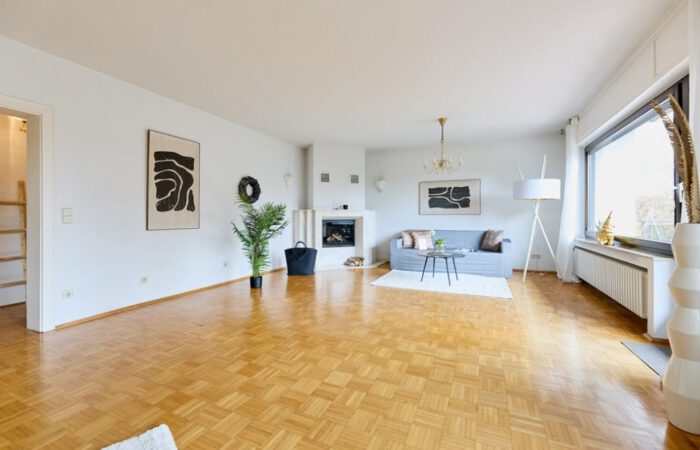 Im Erdgeschoss startet alles in einer Eingangshalle mit ca. 5m Deckenhöhe. Von dort gelangt man durch eine doppelflügelige, weiße Tür mit Facettenschliffgläsern in den luxuriös großen Wohn-Essraum mit ungestörtem Weitblick in den parkähnlichen Garten. Viele Fenster holen den rundum eingewachsenen Garten direkt ins Haus und sorgen für ein entspanntes Wohngefühl, komplett ruhig und nicht einsehbar. Vor dem Wohnraum liegt der große Balkon in Westausrichtung. Er bietet mit 14m² Fläche einen imposanten Sitzplatz mit freiem Blick in die Natur. Ein großer Kamin im Wohnbereich sorgt für pure Gemütlichkeit und ein sehr gut erhaltener Eichenparkettboden für eine elegante Wohnatmosphäre. Ergänzt wird die Ebene durch eine große Küche mit Essplatz und zwei weiteren, flexibel nutzbare Zimmer, zu Bürozwecken oder für Gäste. Selbstverständlich stehen auch ein Duschbad (barrierefrei) und ein Gäste-WC auf dieser Etage zur Verfügung.