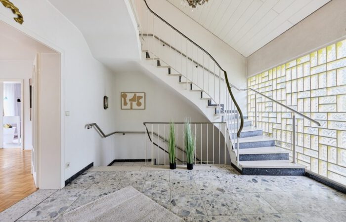 OG: Großzügiger Flurbereich, breite Steintreppe, Wohn- und Schlafräume mit Parkett, Tageslicht-WC, großes Tageslicht-Wannenbad (hell gefliest), Loggia im Schlafbereich