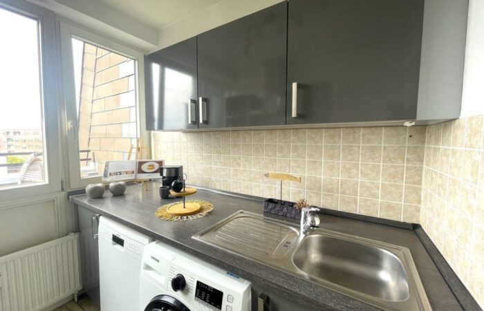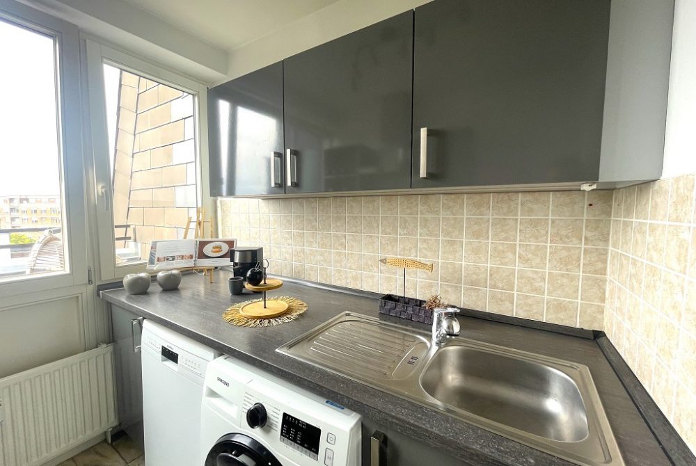 Vom Eingangsbereich führt eine Treppe direkt in die obere Etage, hier lebt es sich offen, hell und loftig. Essen und Wohnen sind mit 38m² großzügig gestaltet und eine kleine Küche mit Fenster zur Logia eignet sich hervorragend zum Vorbereiten des Sundowners. Das Leben auf der obersten Etage eines 8 stöckigen Gebäudes bietet Ruhe, Freiraum und Weitblick.